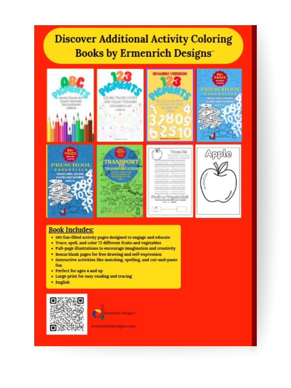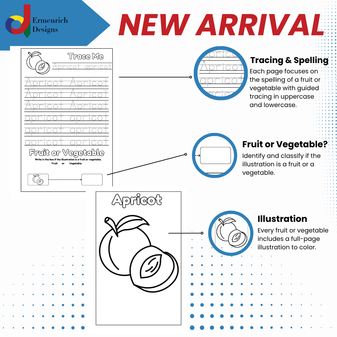 Learn the names of 72 fruits and vegetables while tracing, spelling, and coloring each one. Enjoy hands-on activities like matching, spelling, cutting, pasting, and interactive coloring pages.